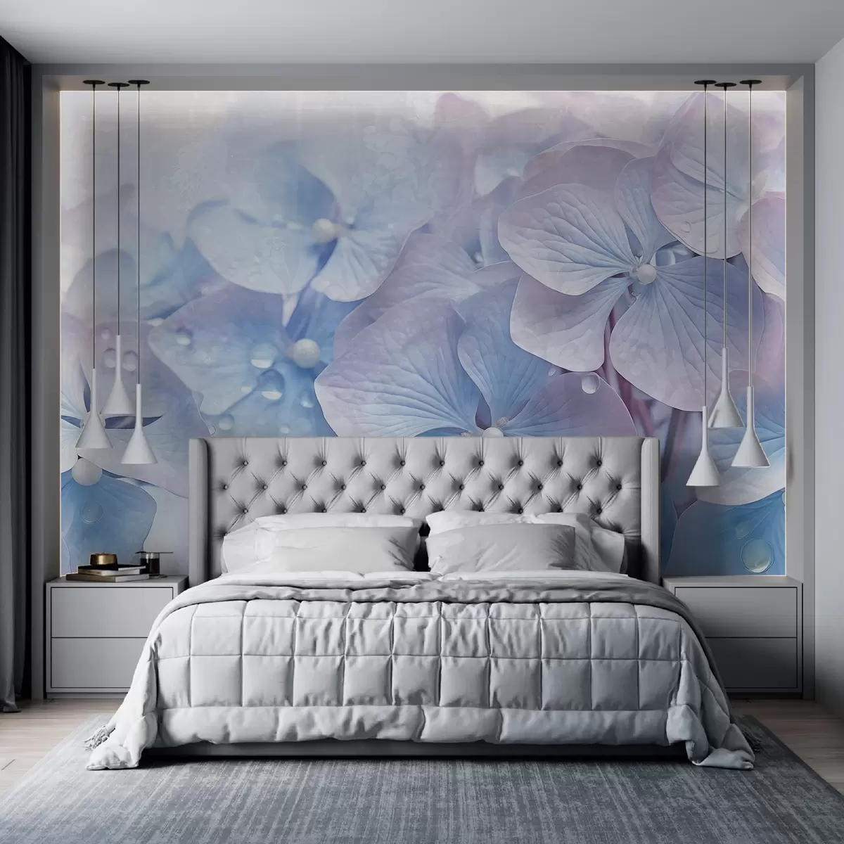 Fotomurales Flores de hortensia azul y rosa con textura vintage y gotas de agua en los pétalos, fondo rosa difuminado Nr. w08981