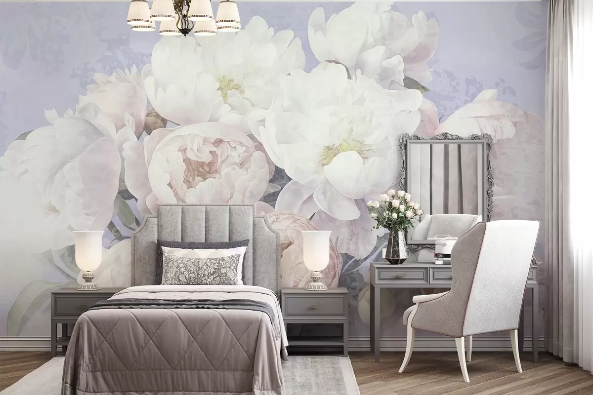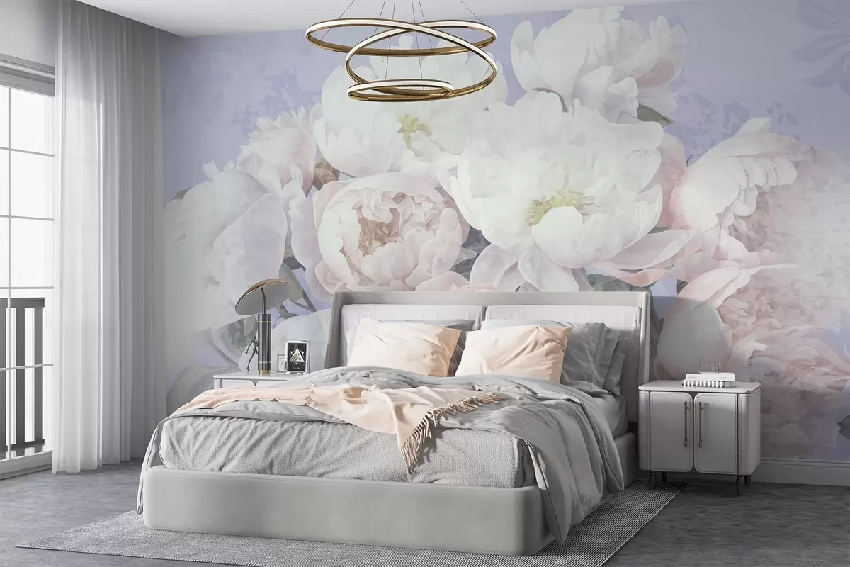 Fotomurales Peonías abstractas en melocotón y blanco con hojas verdes, fondo claro, colores suaves y delicados, estilo vintage Nr. w09008v1