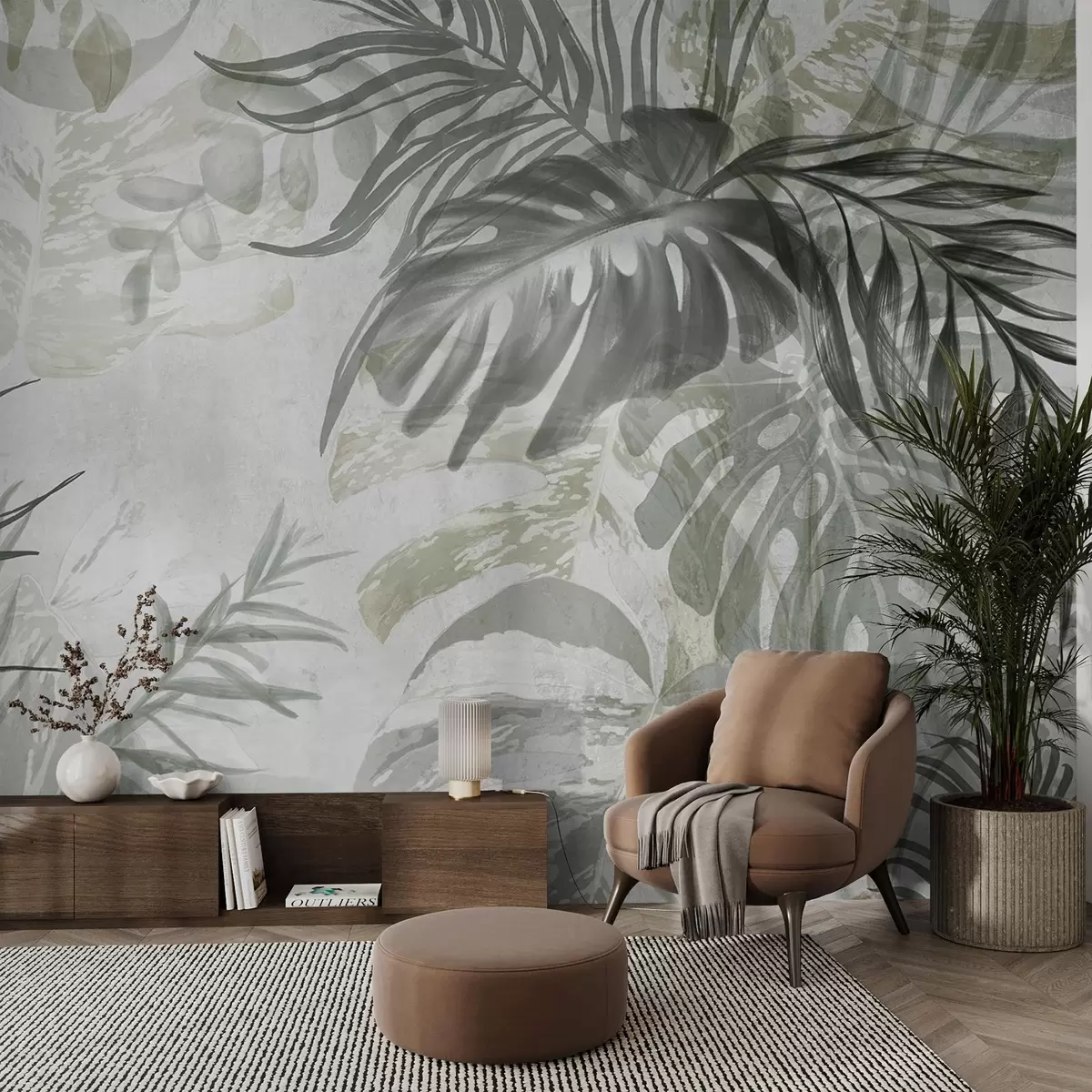 Fotomurales Monstera y hojas de palma en tonos de verde y gris, botánico, follaje tropical, plantas de la selva, fondo texturizado Nr. w09011