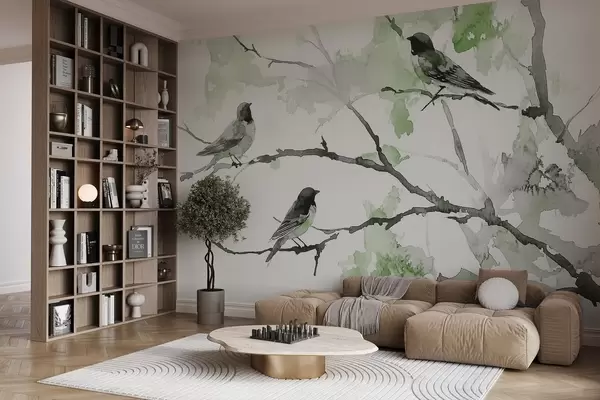 Fotomurales Pájaros en las ramas de los árboles en estilo acuarela Nr. w09064v3