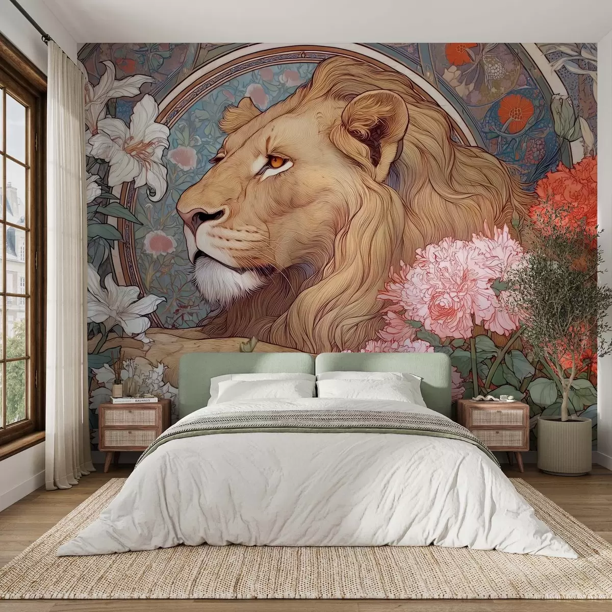 Fotomurales Un león rodeado de muchas flores al estilo de Alphonse Mucha Nr. w09073