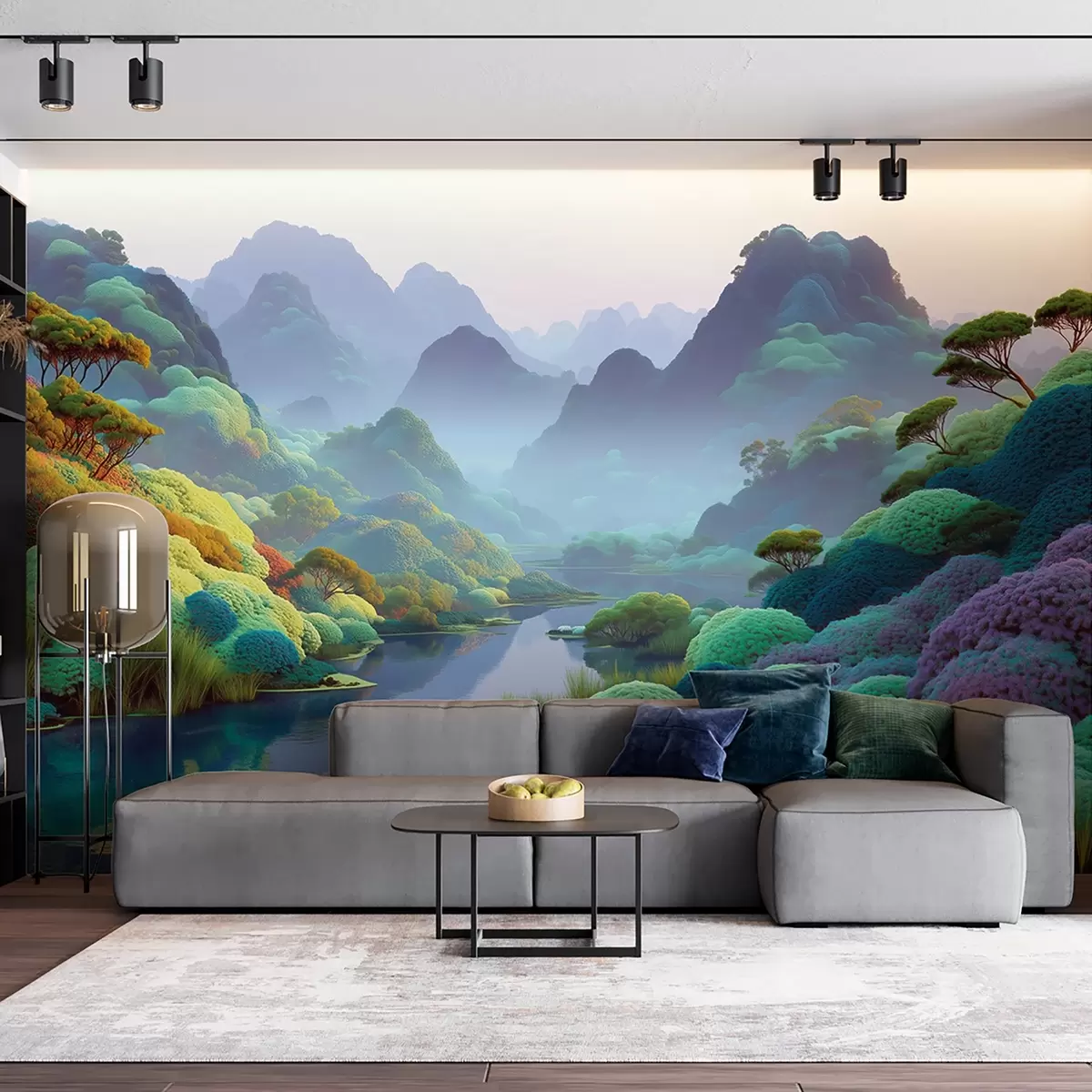 Fotomurales Paisaje de montaña con un río en tonos azules con árboles y arbustos Nr. w09088