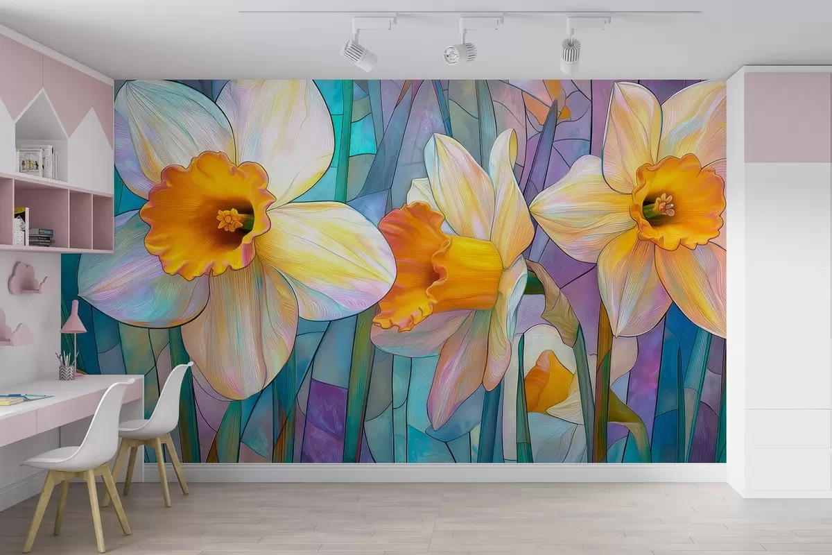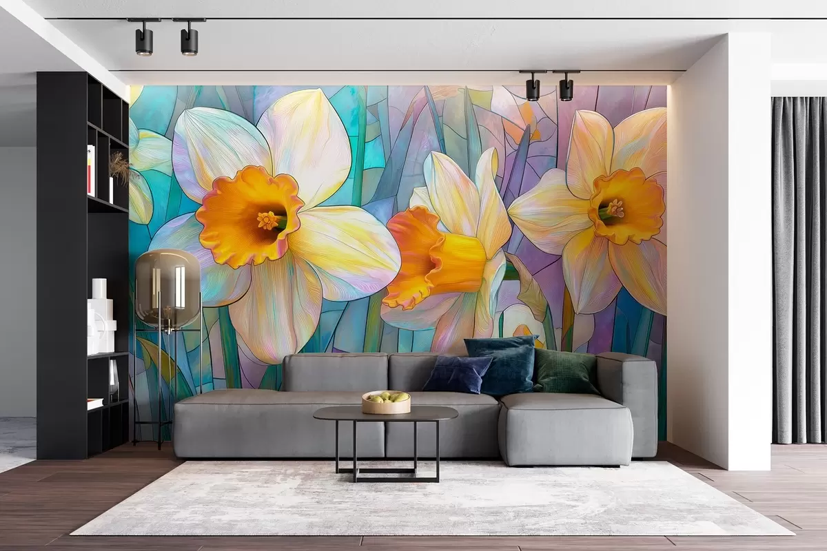 Fotomurales Coloridos narcisos sobre un fondo de vidrieras azul-violeta Nr. w09092