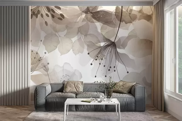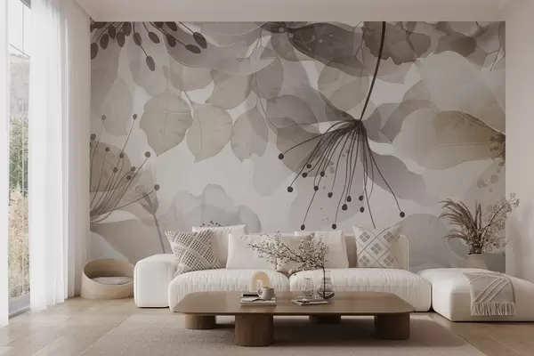 Fotomurales Flores y hojas en colores beige, pétalos y hojas translúcidos, suave efecto acuarela, líneas delicadas, fondo blanco Nr. w09107v1