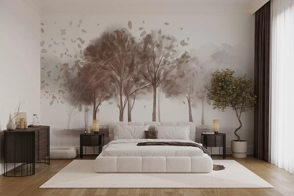 Fotomurales Paisaje abstracto con árboles de hojas marrones reflejándose en el agua, en estilo acuarela texturizada Nr. w09109v1