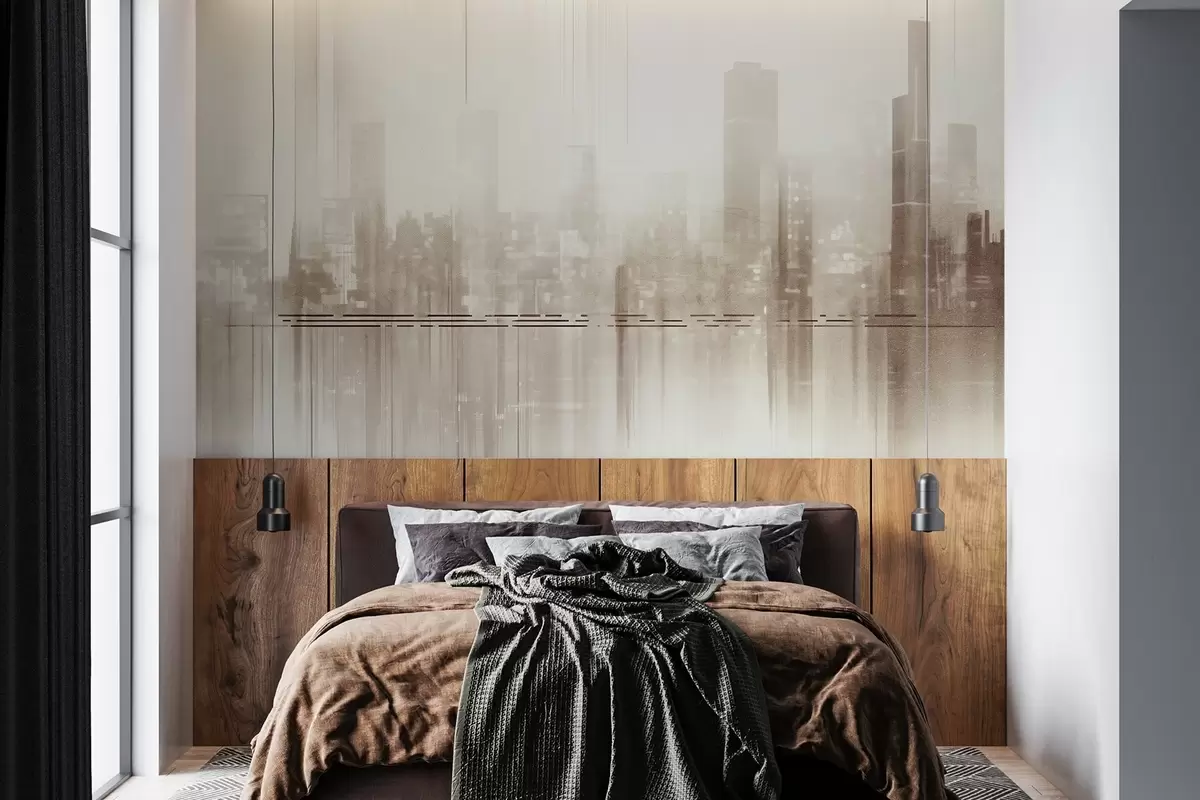 Fotomurales Paisaje urbano abstracto texturizado con edificios altos y bandas, en tonos beige y blanco, creando un efecto brumoso Nr. w09119v1