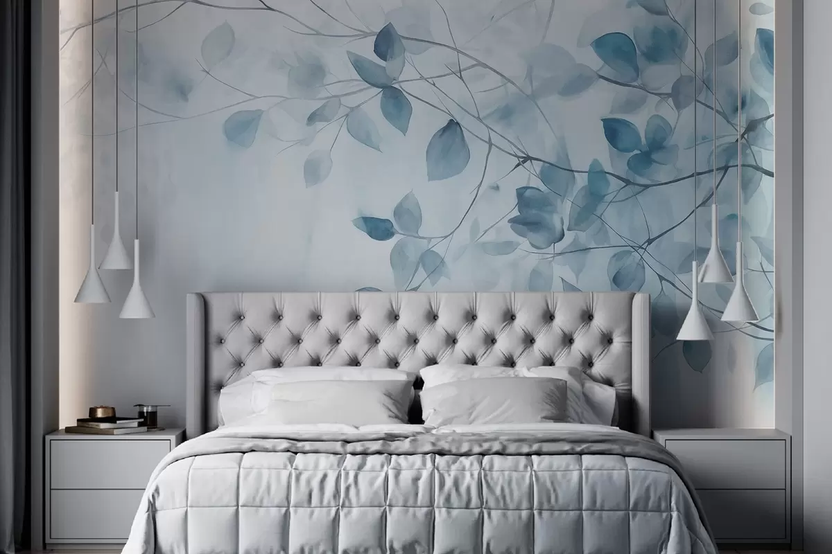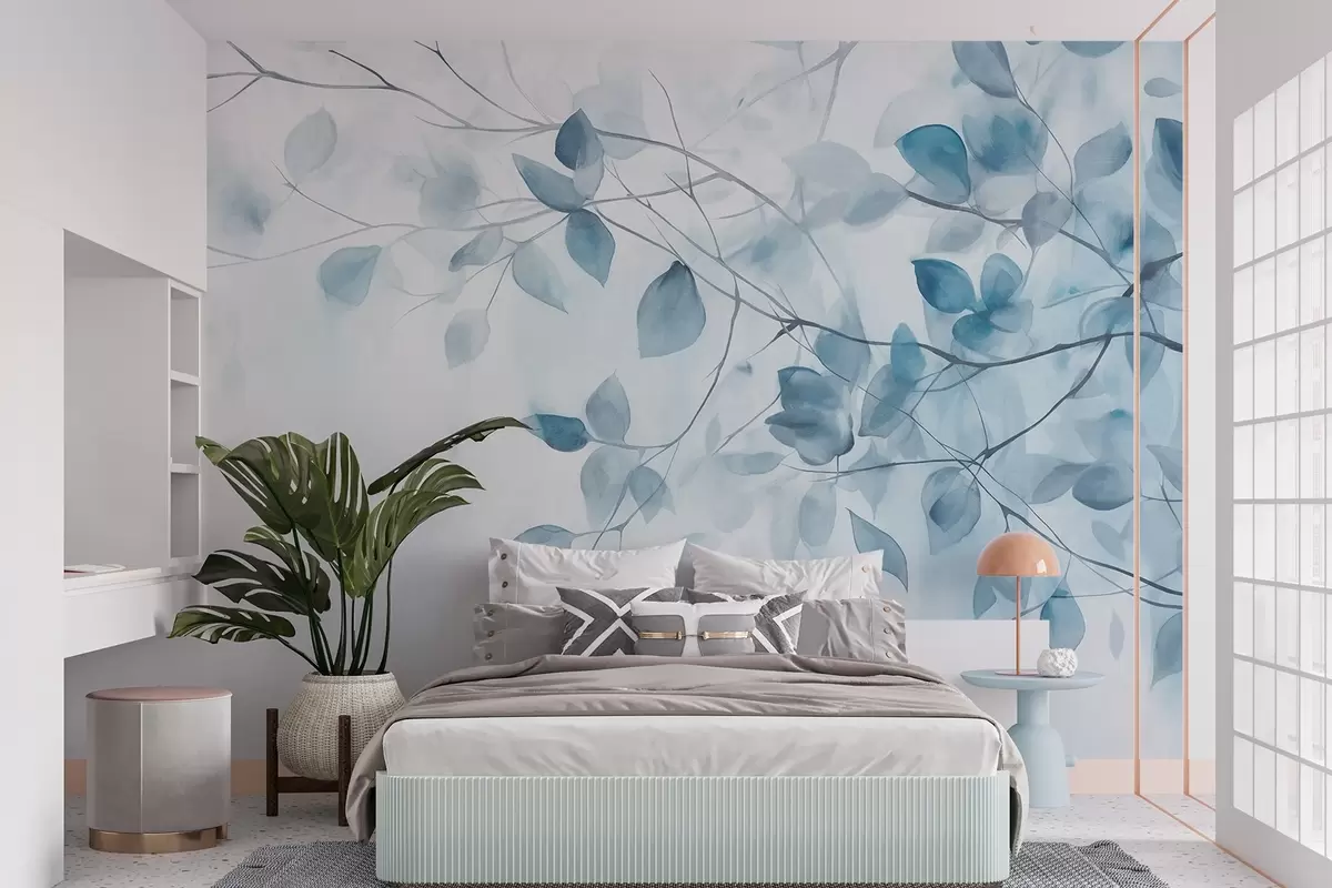 Fotomurales Pintura en acuarela con textura imitando hojas y ramas azules, colores suaves, detalles delicados sobre fondo blanco Nr. w09133v1