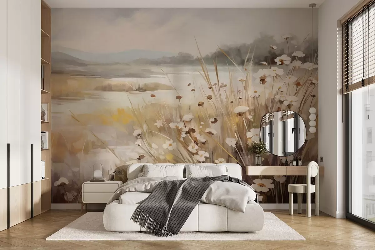 Fotomurales Campo de hierba alta y margaritas blancas, árboles al fondo, bajo un cielo nublado, paisaje con textura, pinceladas suaves Nr. w09139
