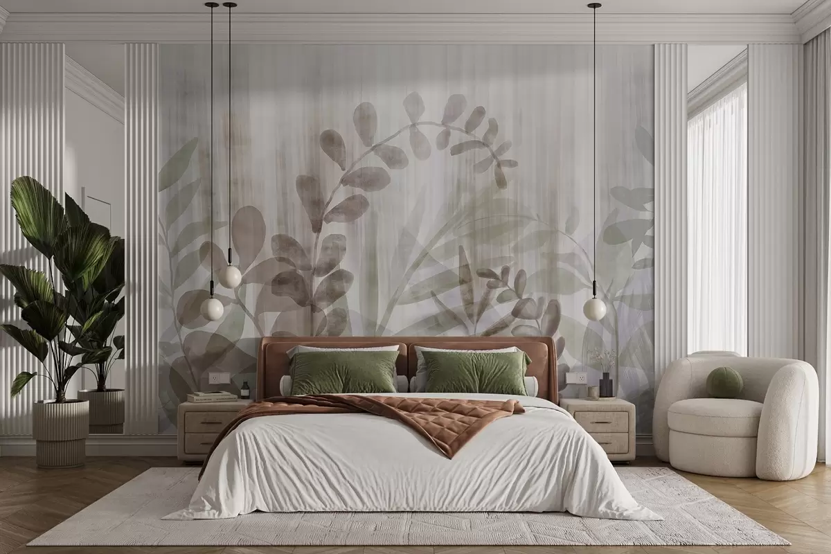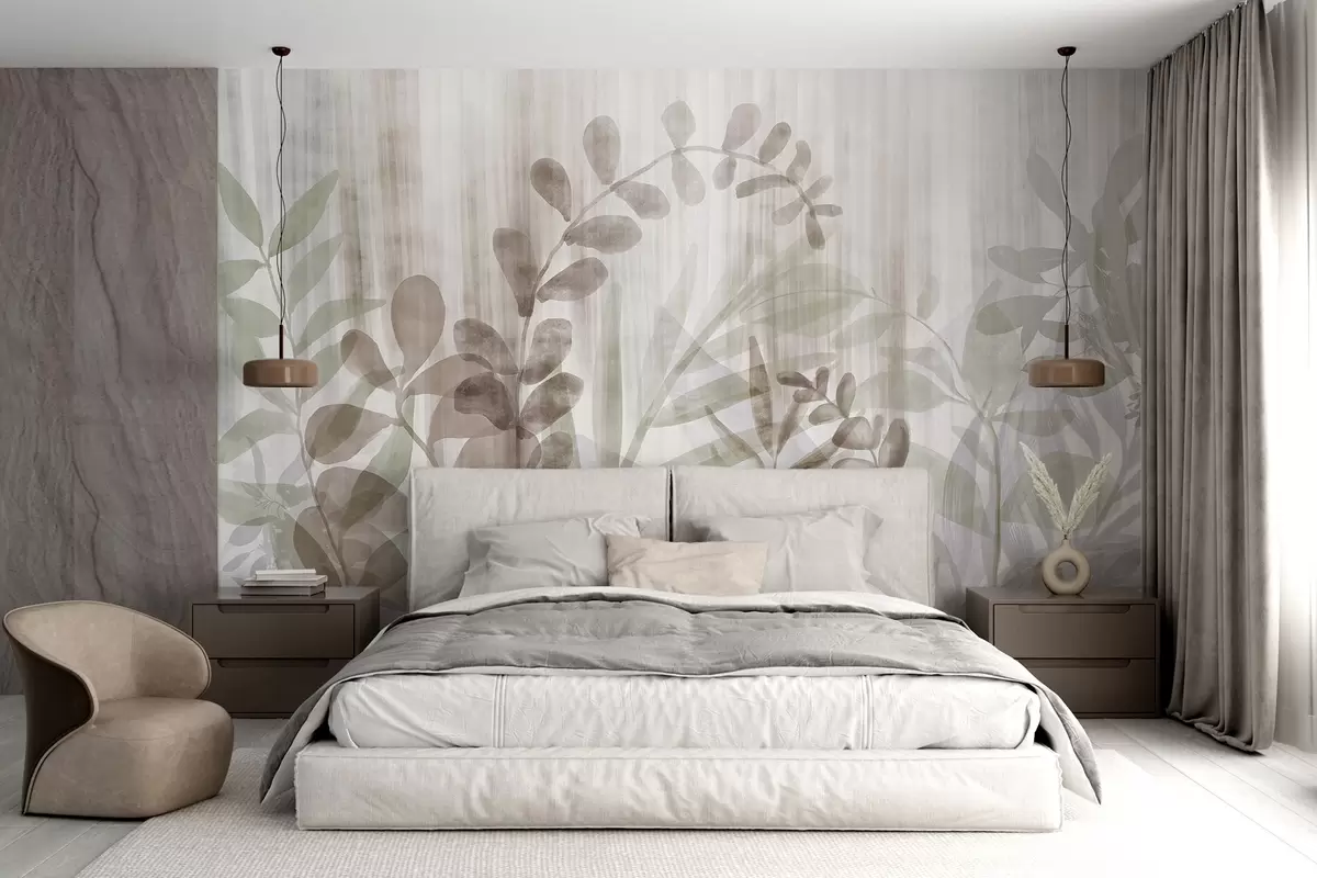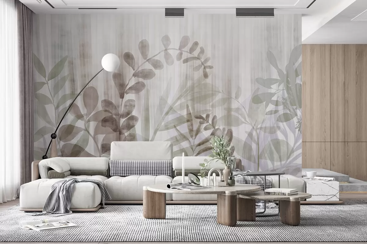 Fotomurales Pintura acuarela imitación de plantas con hojas multicolores apagadas, fondo claro con líneas verticales, ilustración botánica Nr. w09146v1