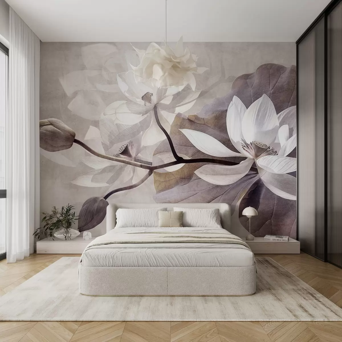 Fotomurales Delicadas flores de loto con hojas y tallos en una suave paleta de colores beis Nr. w09159