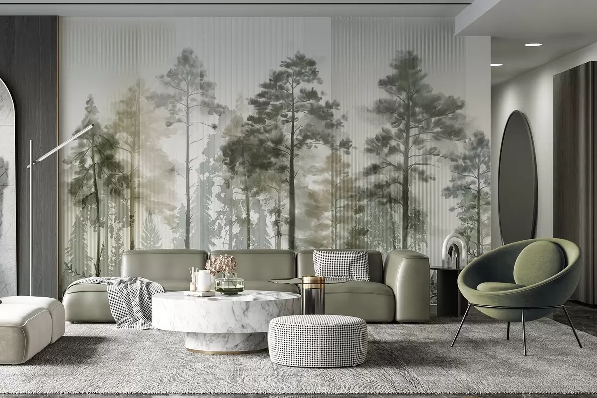 Fotomurales Un denso bosque con altos pinos, exuberante follaje verde, una atmósfera brumosa con texturas de líneas verticales Nr. w09163