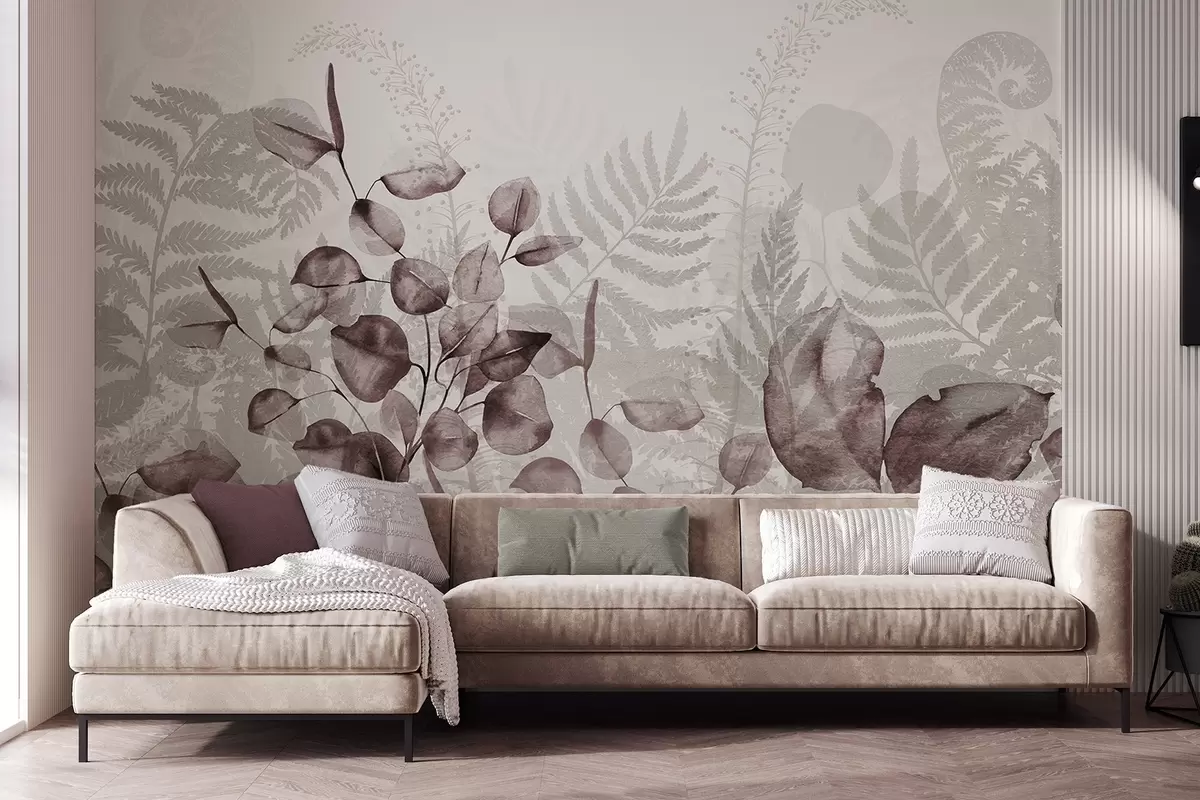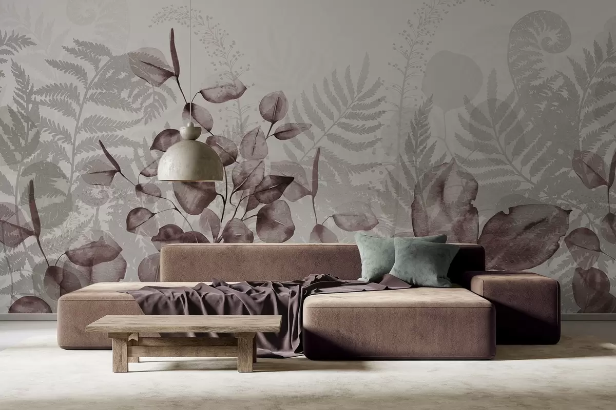 Fotomurales Hojas de eucalipto y helecho en tonos bordo y gris, efecto acuarela , ilustración botánica Nr. w09197v1