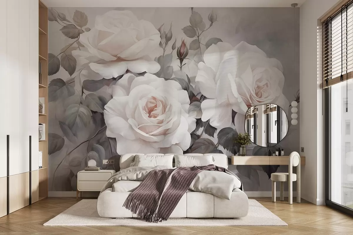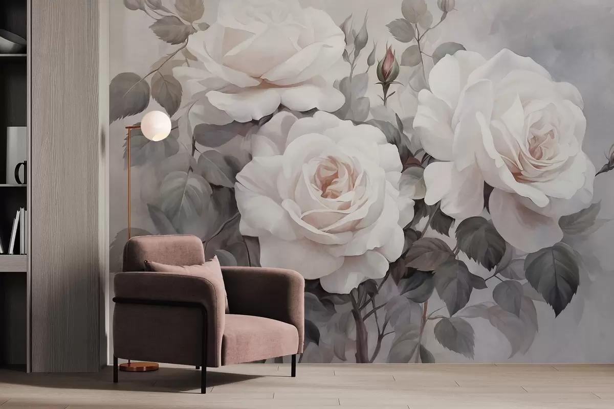 Fotomurales Rosas blancas texturizadas con hojas y tallos, suaves colores pastel apagados, elegante estilo vintage , delicadas pinceladas Nr. w09198