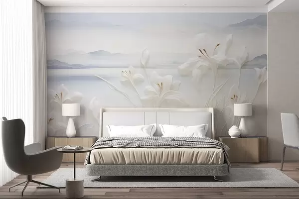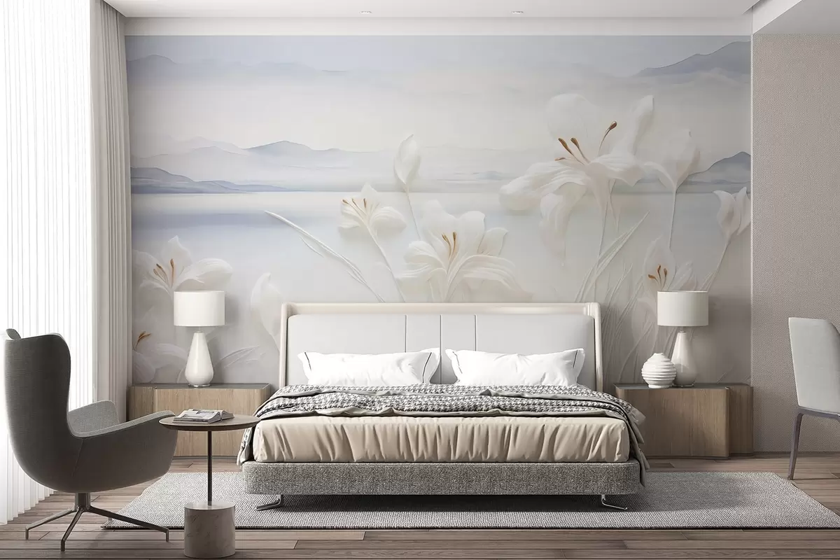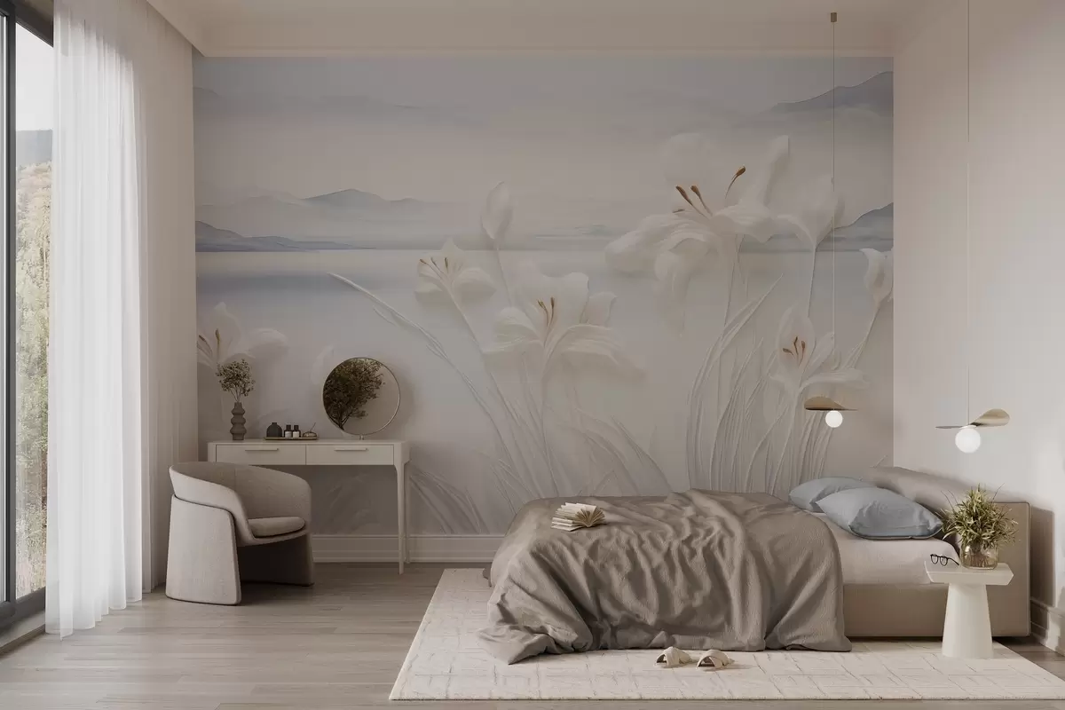 Fotomurales Lirios blancos con largos tallos y hojas, montañas y lago al fondo, composición paisajística minimalista Nr. w09206