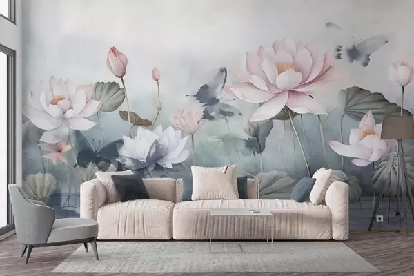 Fotomurales Flores de loto texturizadas con pétalos rosa pastel, hojas verdes, reflejo de agua, colores pastel suaves , efecto acuarela Nr. w09254