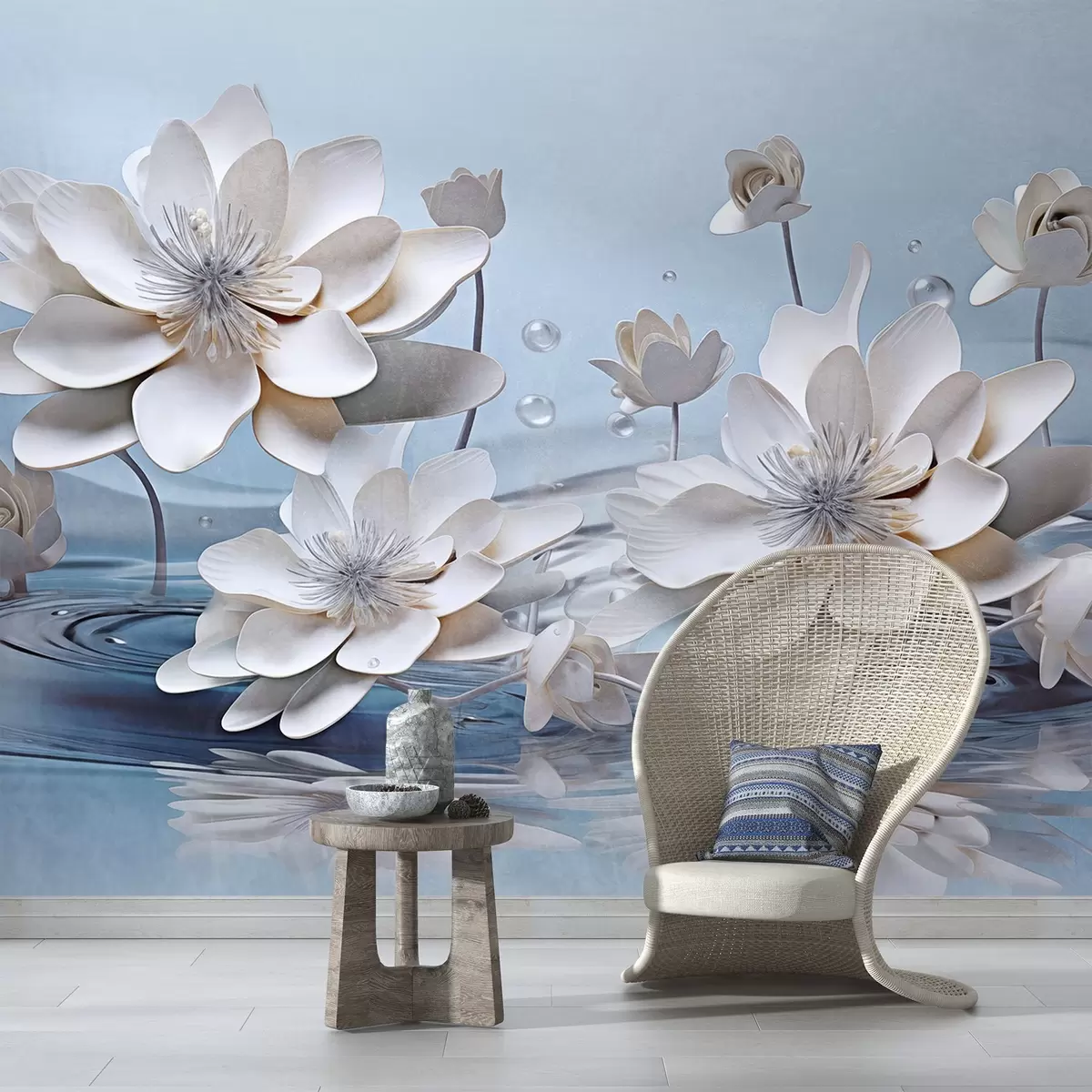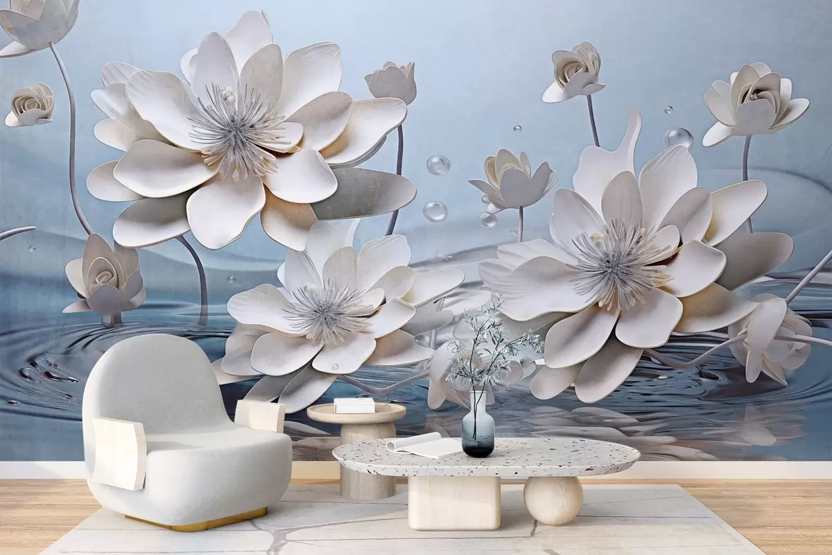 Fotomurales Flores blancas texturizadas con gotas de agua, reflejos en la superficie del agua, fondo azul claro, diseño elegante Nr. w09262