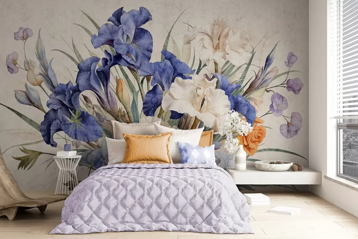 Fotomurales Ramo con textura vintage de lirios morados, dispuestos con hojas y tallos verdes, sobre un fondo suave Nr. w09263