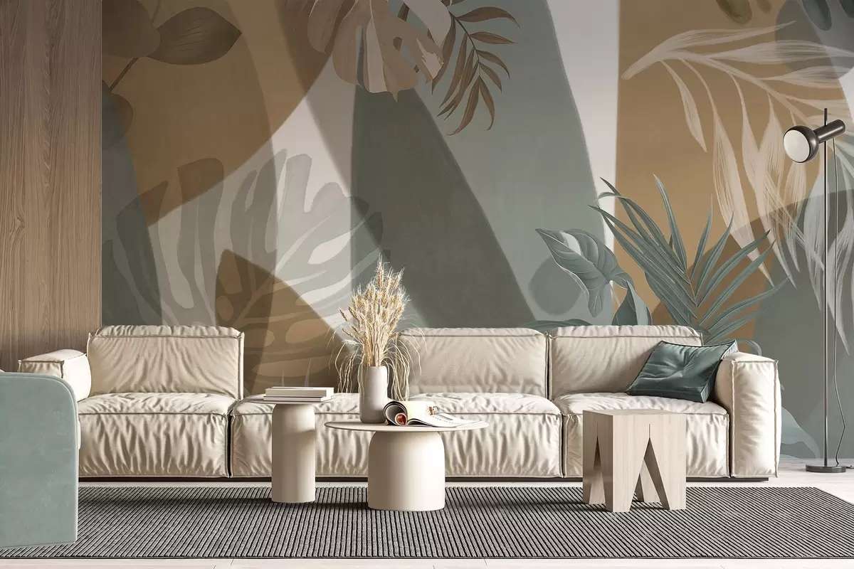 Fotomurales Hojas de Monstera y hojas de palma en un patrón con colores marrón, blanco y verde, ambiente tropical, formas abstractas, decorativo Nr. w09288
