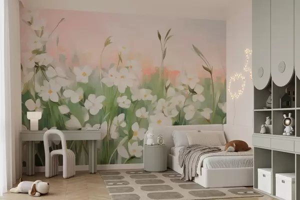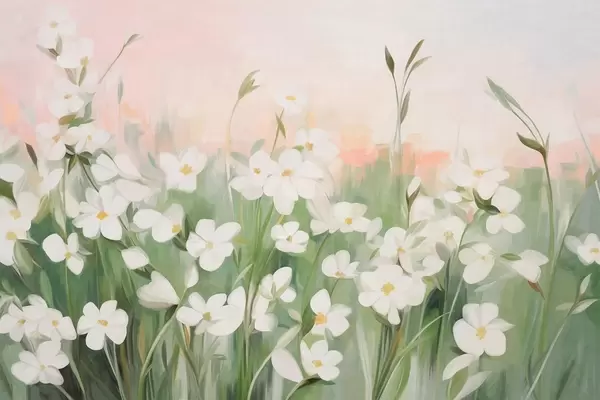 Fotomurales Campo abstracto de flores silvestres con tallos y hojas verdes, sobre un cielo texturizado de color rosa pálido y blanco. Nr. w09297