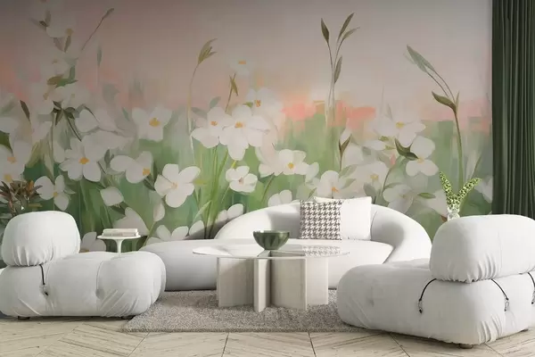Fotomurales Campo abstracto de flores silvestres con tallos y hojas verdes, sobre un cielo texturizado de color rosa pálido y blanco. Nr. w09297