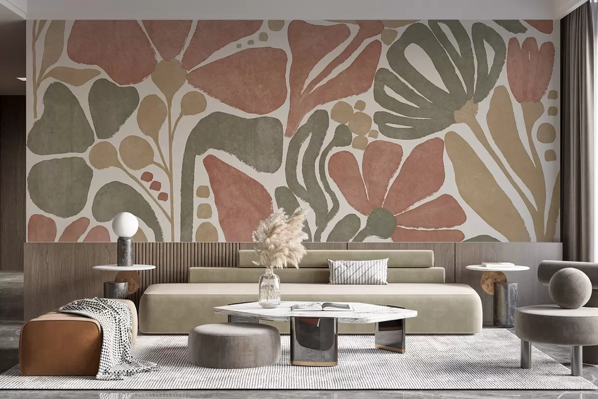 Fotomurales Flores abstractas en tonos rojos, verdes y beige, con un fondo claro, en un diseño plano, estilizado, moderno y minimalista Nr. w09315