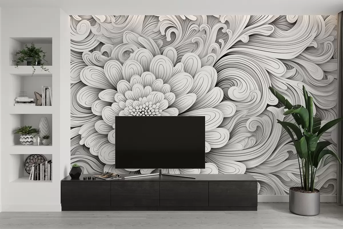 Fotomurales Motivo decorativo en blanco y negro en forma de flor y remolinos Nr. w09355