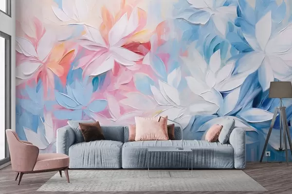 Fotomurales Flores blancas con textura y hojas rosas y azules, pintura al óleo de estilo abstracto, pinceladas suaves, colores pastel Nr. w09396