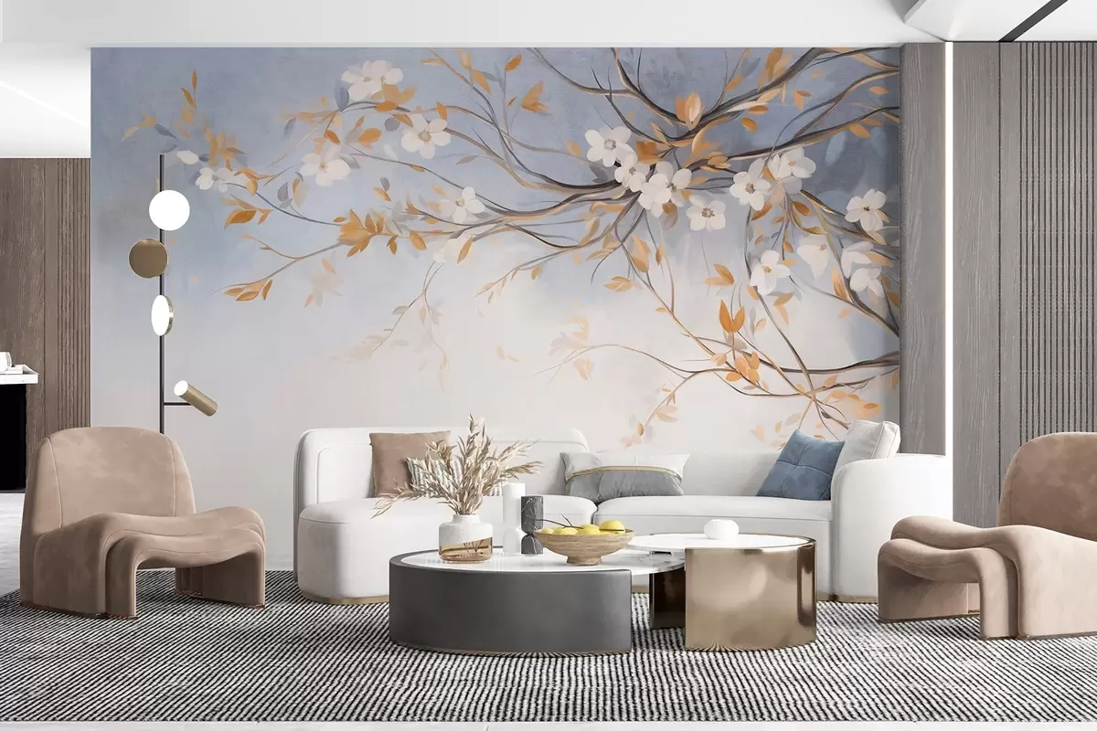 Fotomurales Flores blancas con hojas naranjas en una rama de árbol, fondo azul claro con textura, delicadas pinceladas Nr. w09415