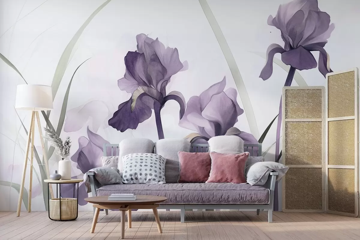 Fotomurales Flores de iris moradas con tallos verdes, estilo acuarela, fondo blanco, colores suaves, elegante, artístico Nr. w09425