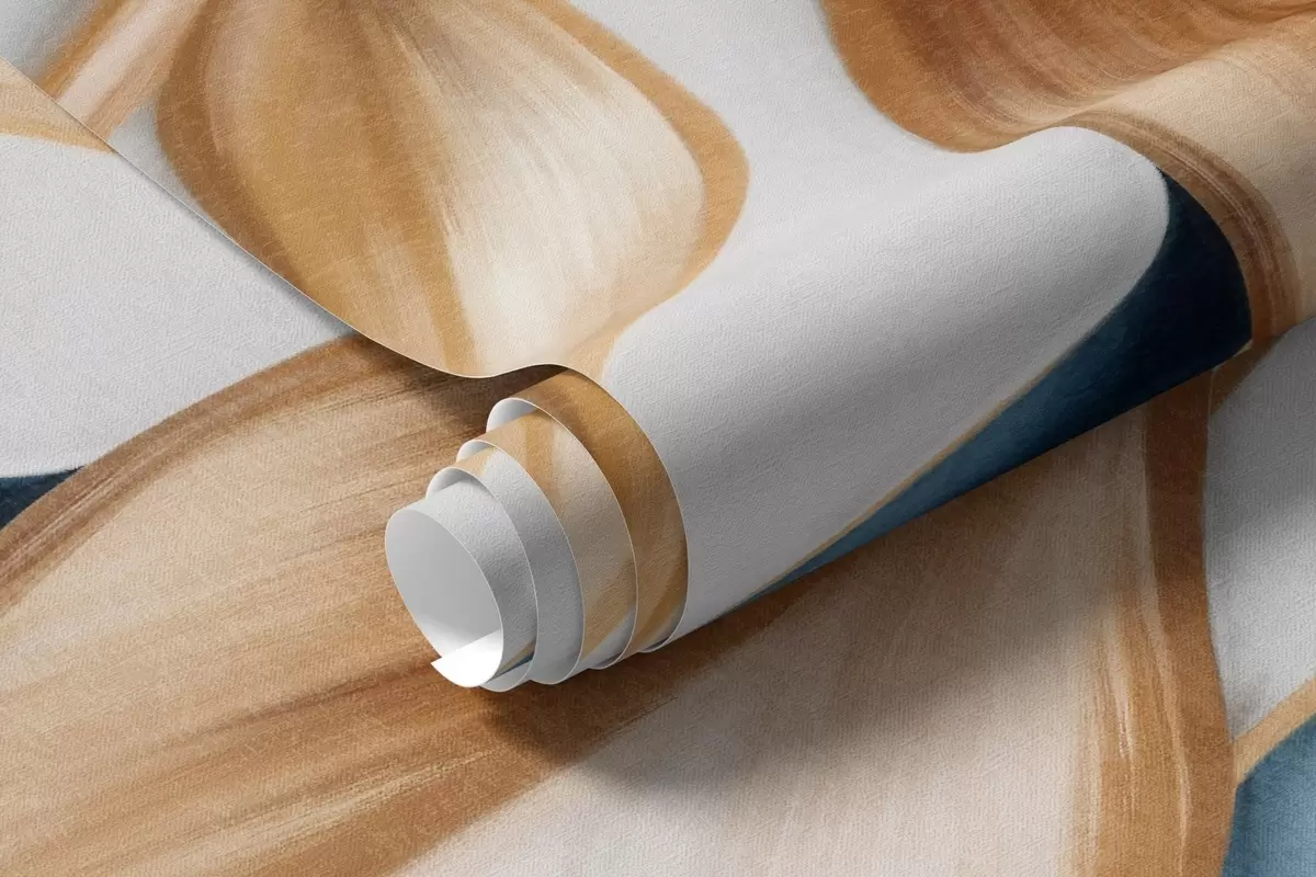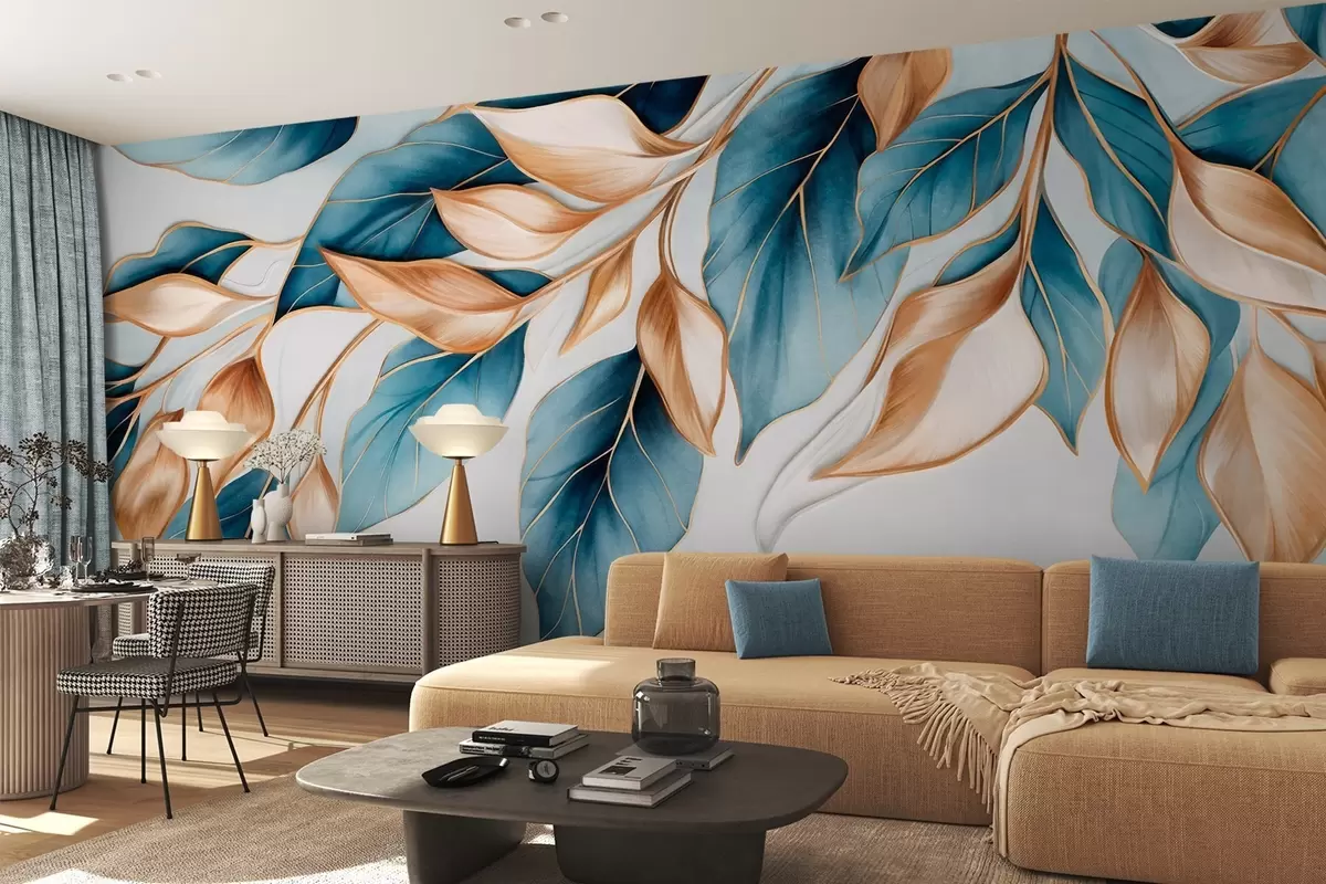 Fotomurales Hojas azules y naranjas con textura, fondo azul claro, diseño elegante y artístico, estilo moderno. Nr. w09429