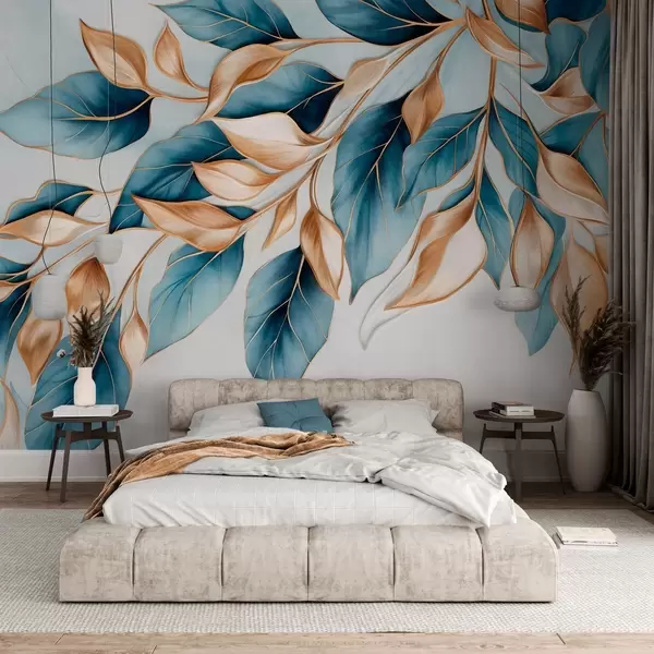 Fotomurales Hojas azules y naranjas con textura, fondo azul claro, diseño elegante y artístico, estilo moderno Nr. w09429