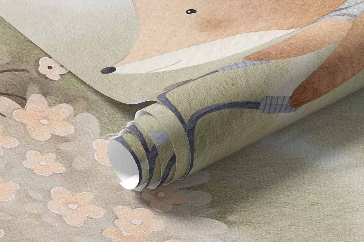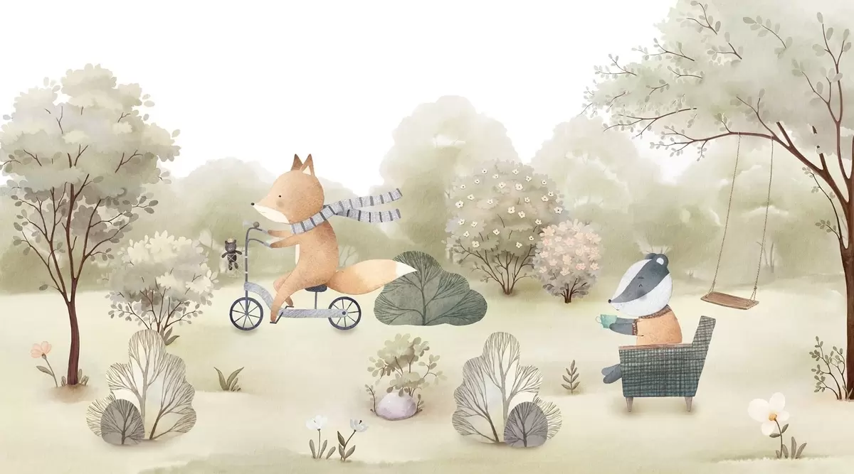 Fotomurales Zorro en bicicleta y tejón con té, animales del bosque en estilo acuarela Nr. w09439