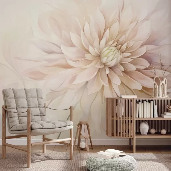 Fotomurales Una flor de dalia rosa claro con muchos pétalos, fondo pastel de textura suave con toques de verde y beige Nr. w09470