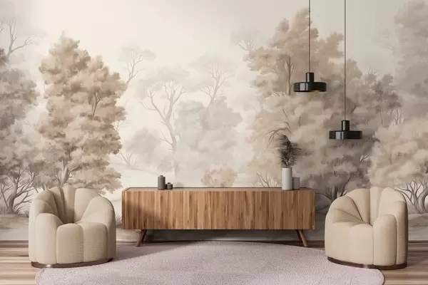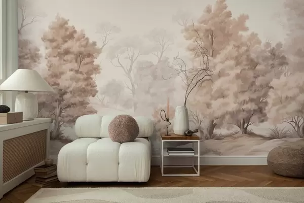 Fotomurales Pintura paisajística texturizada que imita un bosque con árboles altos y hierba, colores apagados y suaves, escena relajante Nr. w09474