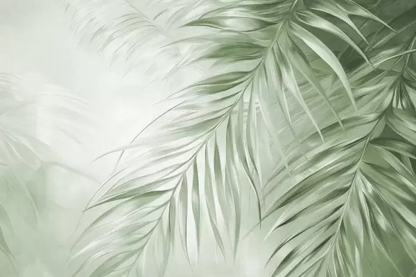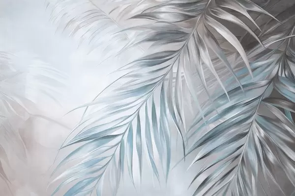 Fotomurales Hojas de palmera con tonos naranjas y azules, fondo con textura ligera y colores suaves, elegante estilo tropical Nr. w09475