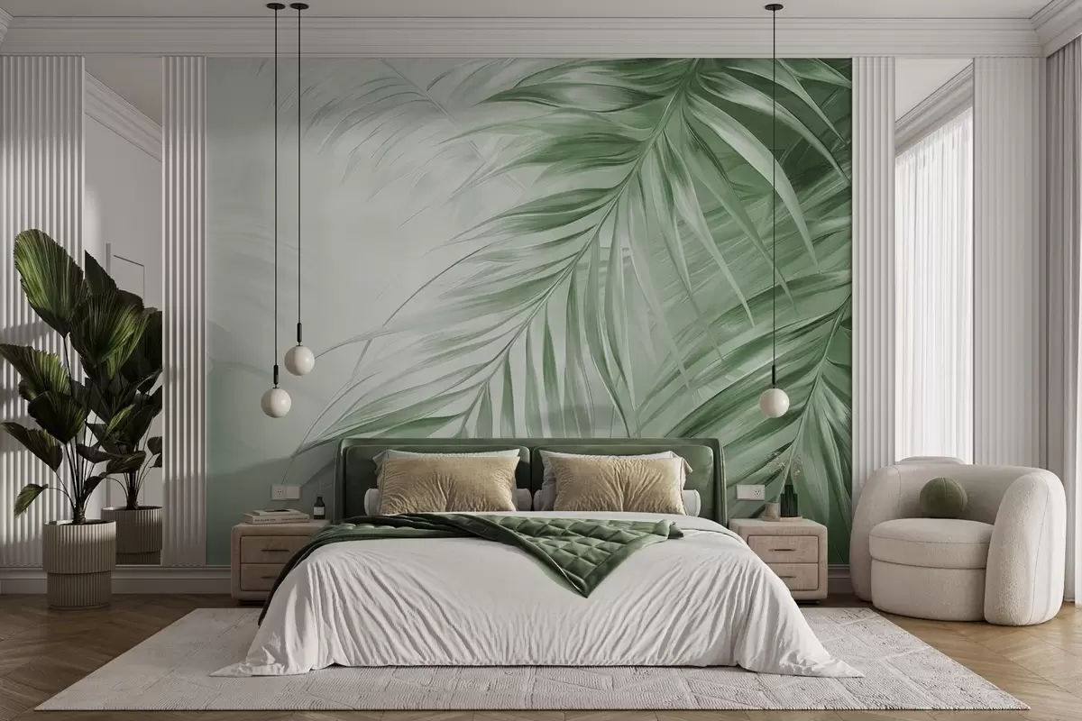 Fotomurales Hojas de palmera con tonos verdes, fondo con textura ligera y colores suaves, elegante estilo tropical Nr. w09475v2