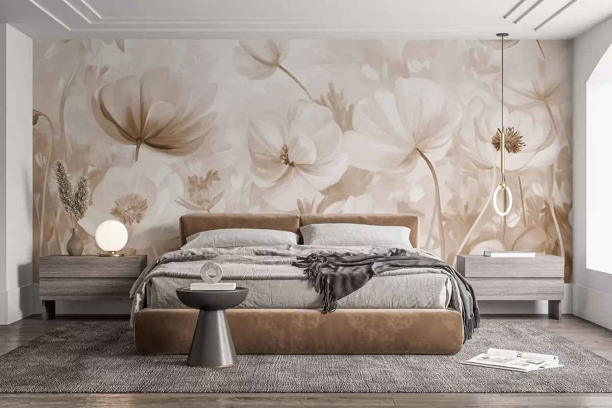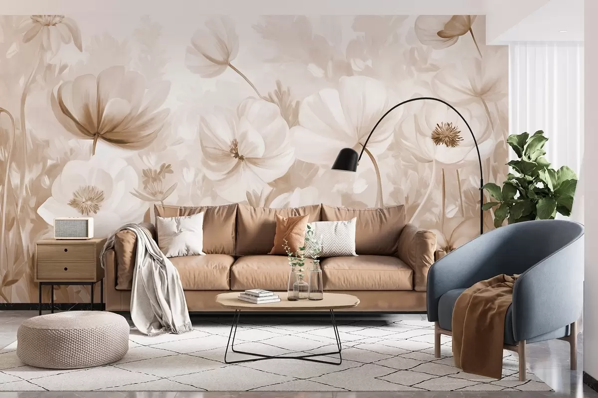 Fotomurales Un campo de flores beige con delicados pétalos y suaves hojas marrones, en un estilo acuarela de ensueño y texturizado Nr. w09481v1