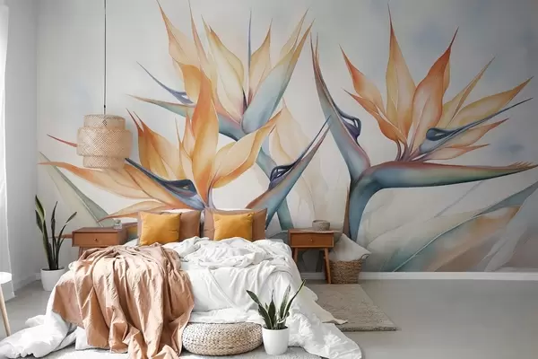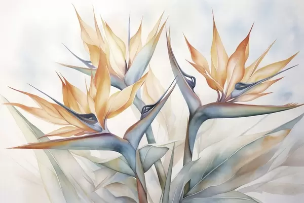 Fotomurales Flor del ave del paraíso, strelitzia con pétalos naranjas, estilo texturizado en acuarela suave, fondo claro Nr. w09483