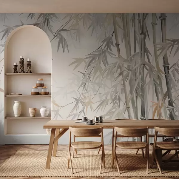 Fotomurales Tallos y hojas de bambú texturizados en una paleta de colores suaves y apagados de gris, blanco y crema, composición minimalista. Nr. w09485