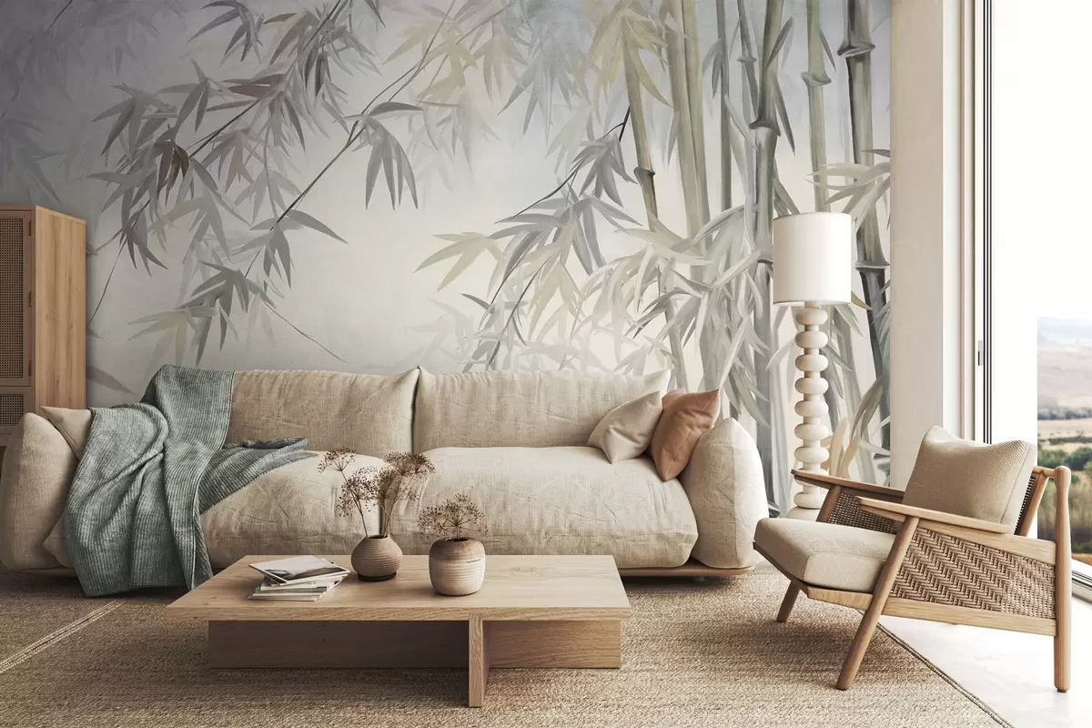 Fotomurales Tallos y hojas de bambú texturizados en una paleta de colores suaves y apagados de gris, blanco y crema, composición minimalista. Nr. w09485