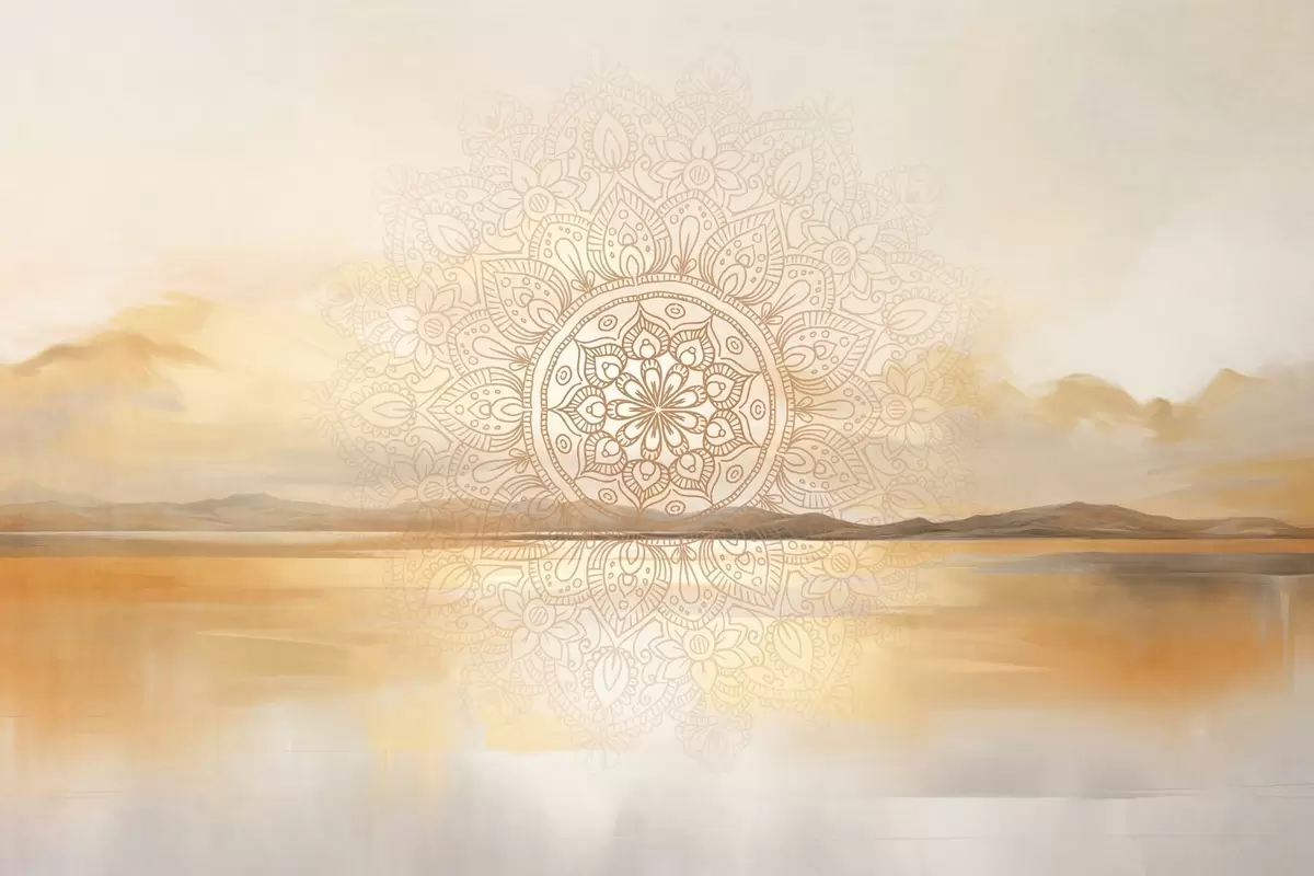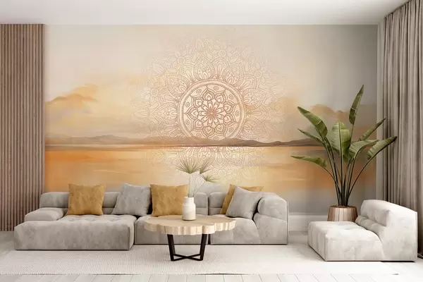 Fotomurales Diseño mandala simétrico con textura superpuesto a un paisaje con mar, colinas y cielo, en suaves colores pastel. Nr. w09491