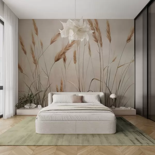 Fotomurales Campo con textura de trigo con espigas amarillas, fondo beige, iluminación natural, tonos cálidos, pinceladas detalladas Nr. w09493