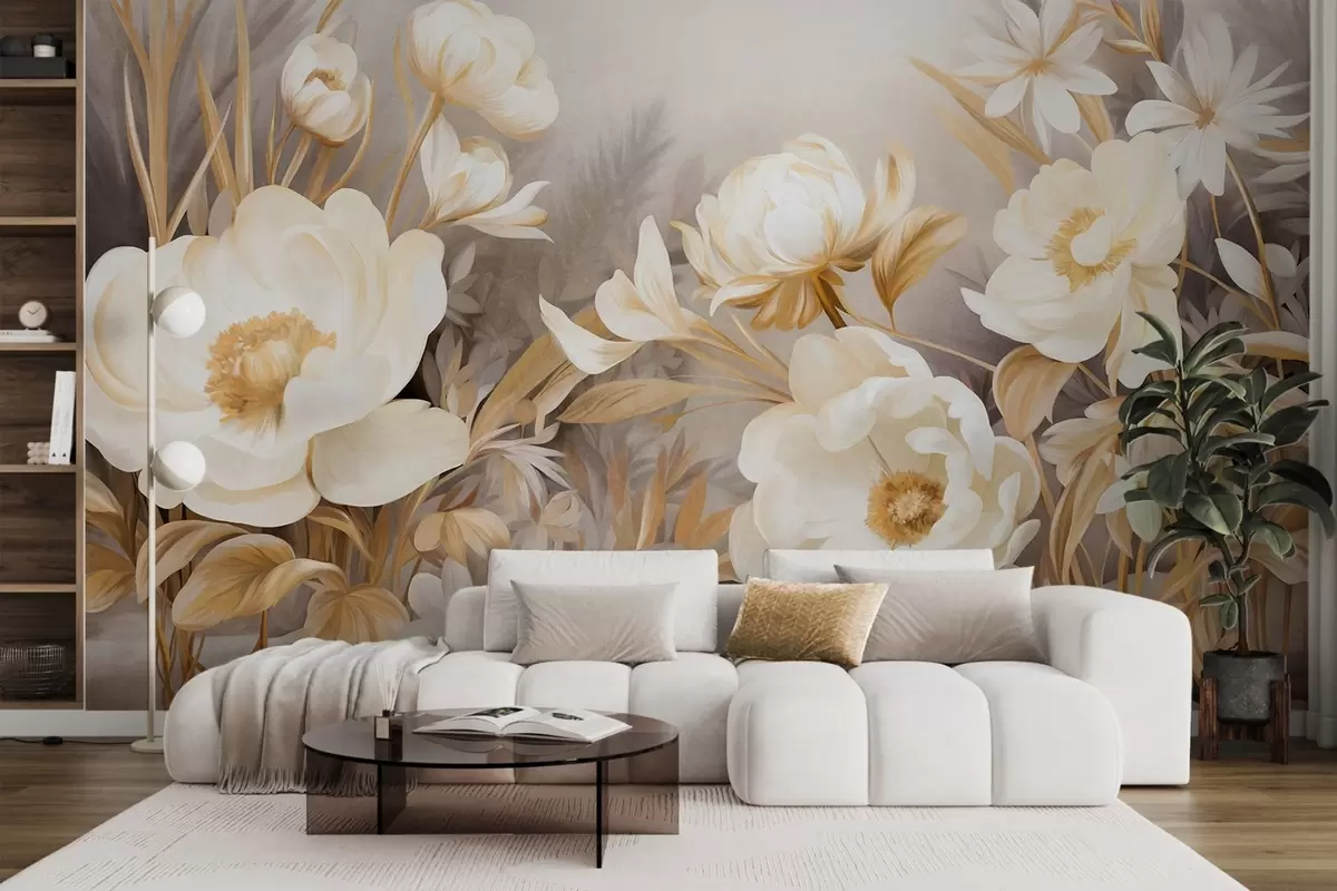 Fotomurales Peonías blancas y amarillas y otras flores con hierba alta y hojas en un estilo suave y pictórico con textura. Nr. w09494