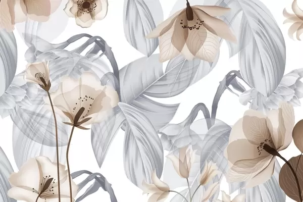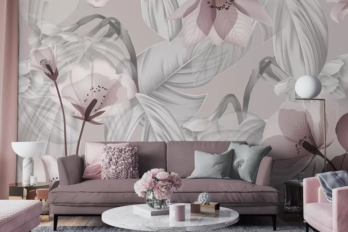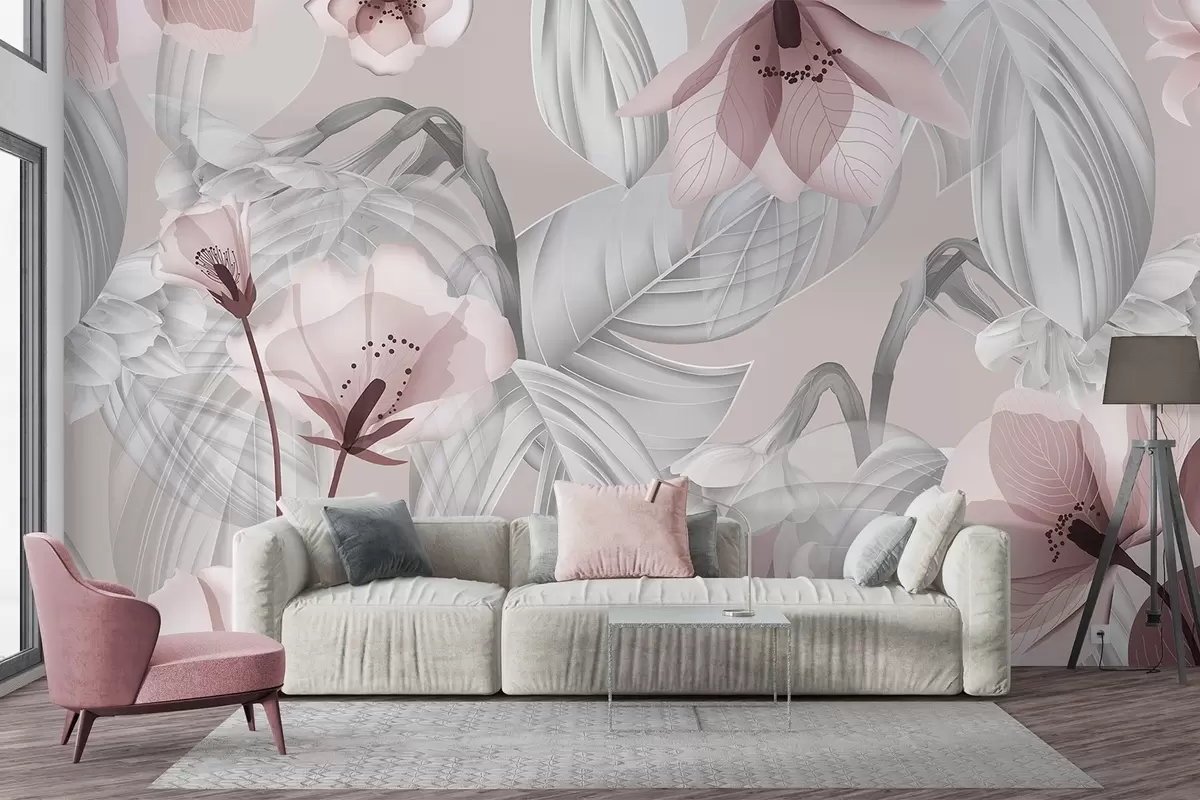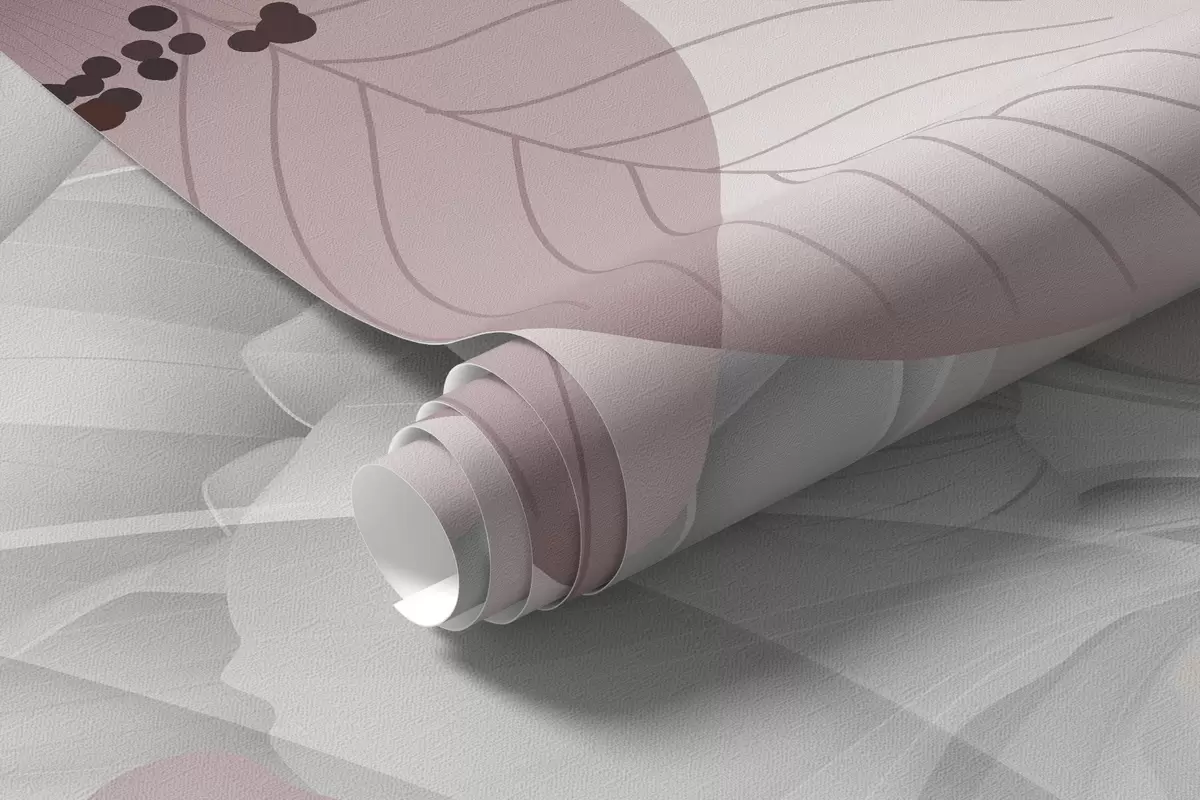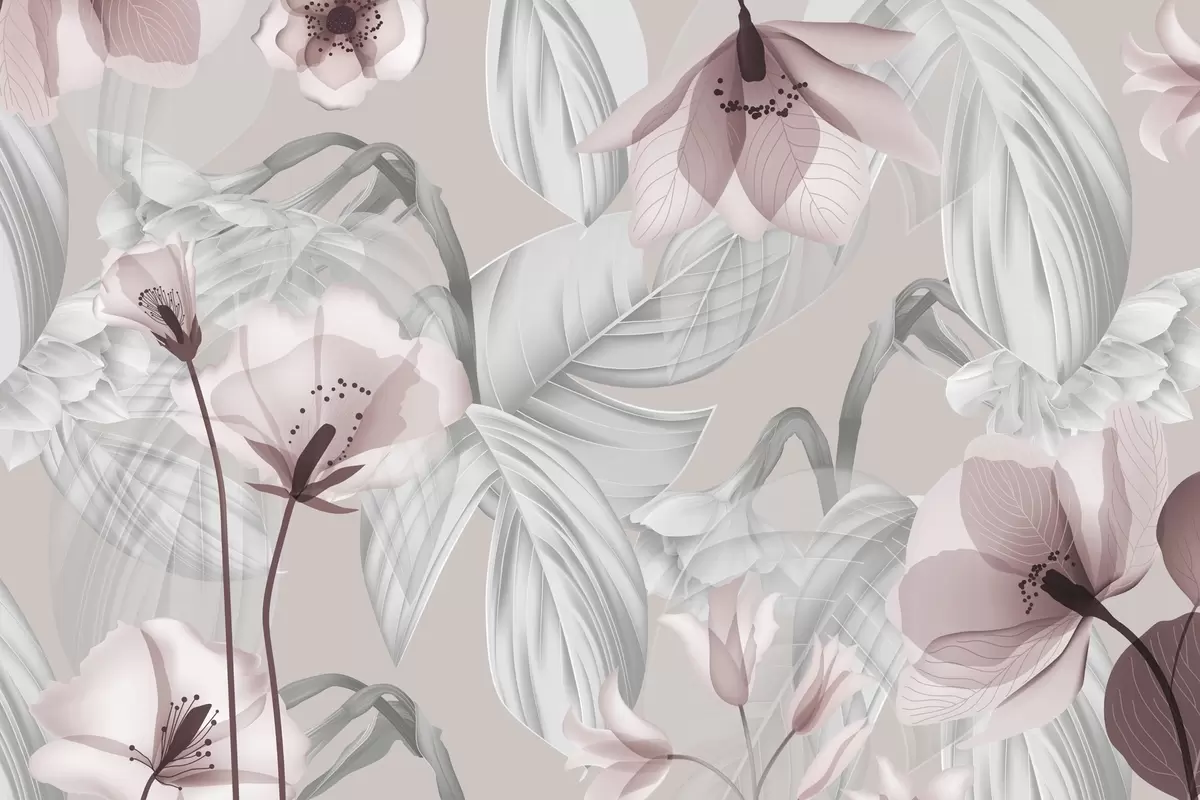 Fotomurales Flores rosas y hojas grises, fondo botánico floral, diseño elegante, colores suaves, detalles delicados y ligeros Nr. w09497