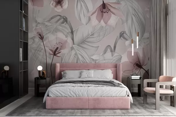 Fotomurales Flores rosas y hojas grises, fondo botánico floral, diseño elegante, colores suaves, detalles delicados y ligeros Nr. w09497