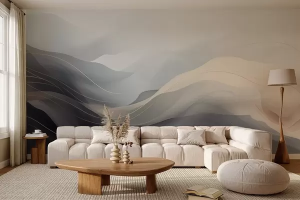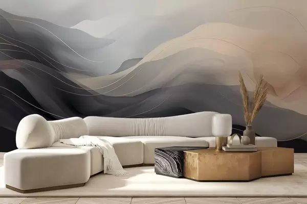 Fotomurales Olas abstractas y brumosas en tonos grisáceos y crema con líneas amarillas Nr. w09504