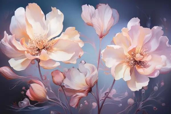 Fotomurales Peonías aireadas en color rosa crema, pintadas al estilo acuarela sobre un fondo azul intenso. Nr. w09513