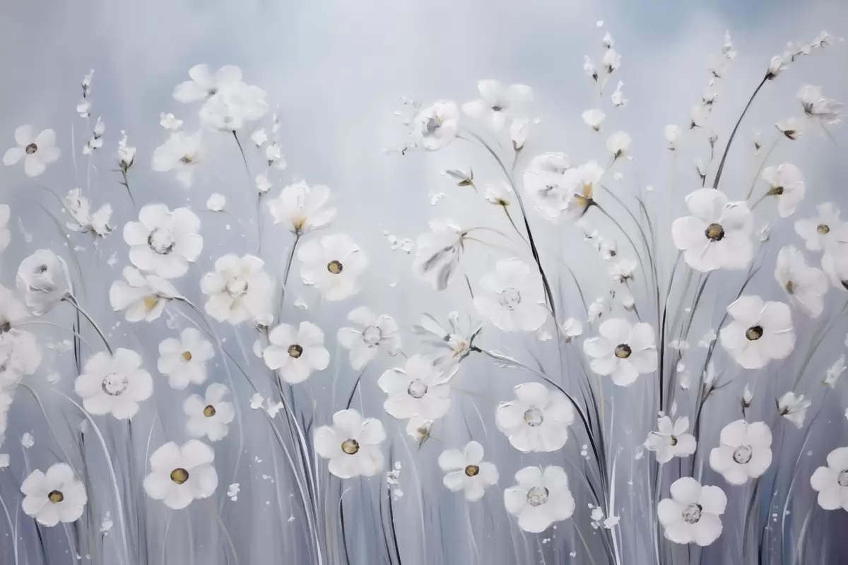 Fotomurales Flores blancas contra montañas azules y un lago en estilo pintura al óleo. Nr. w09516
