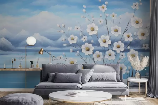 Fotomurales Flores blancas primaverales junto a un lago helado con montañas nevadas, pintadas al óleo Nr. w09526