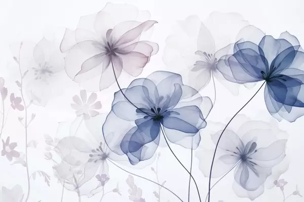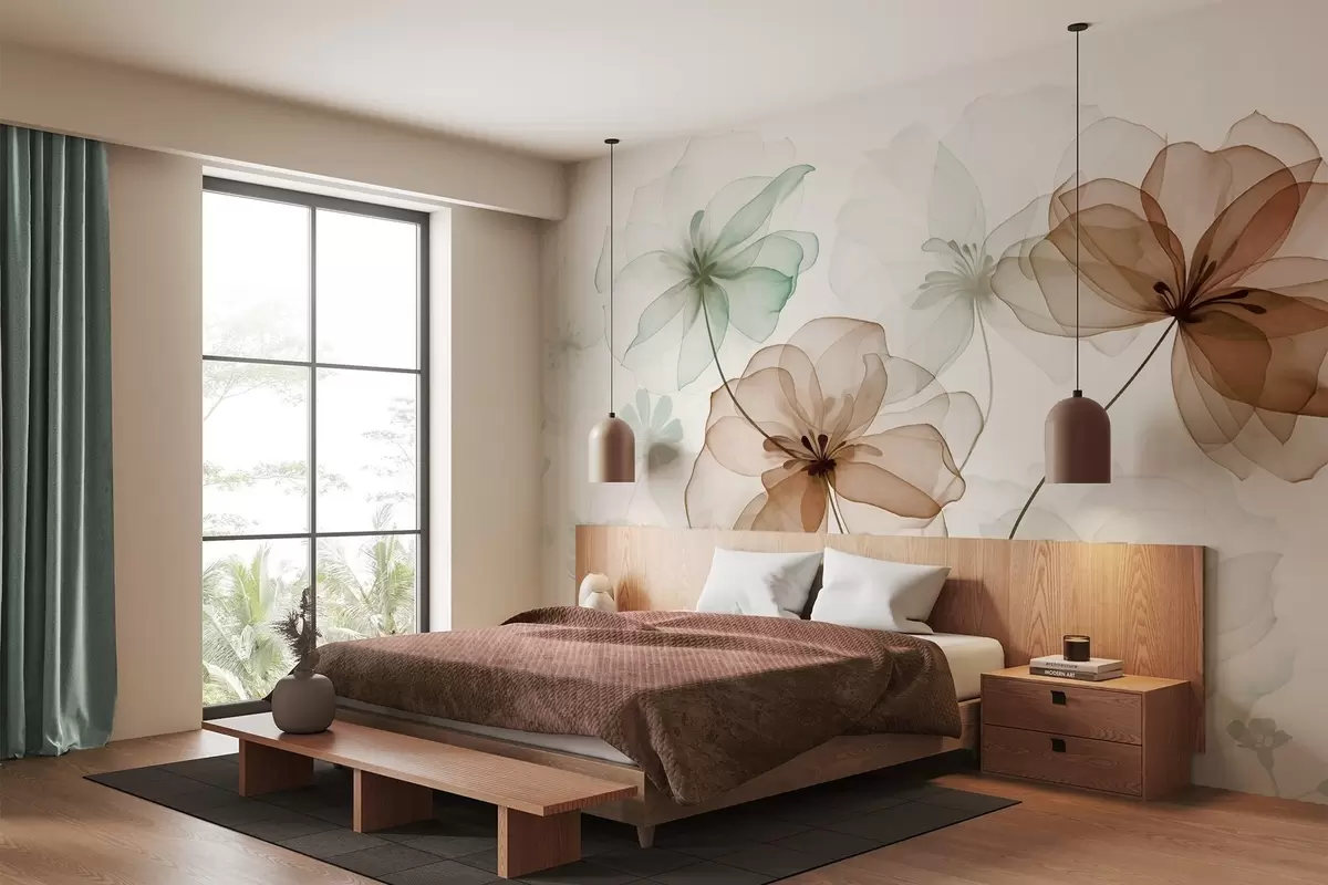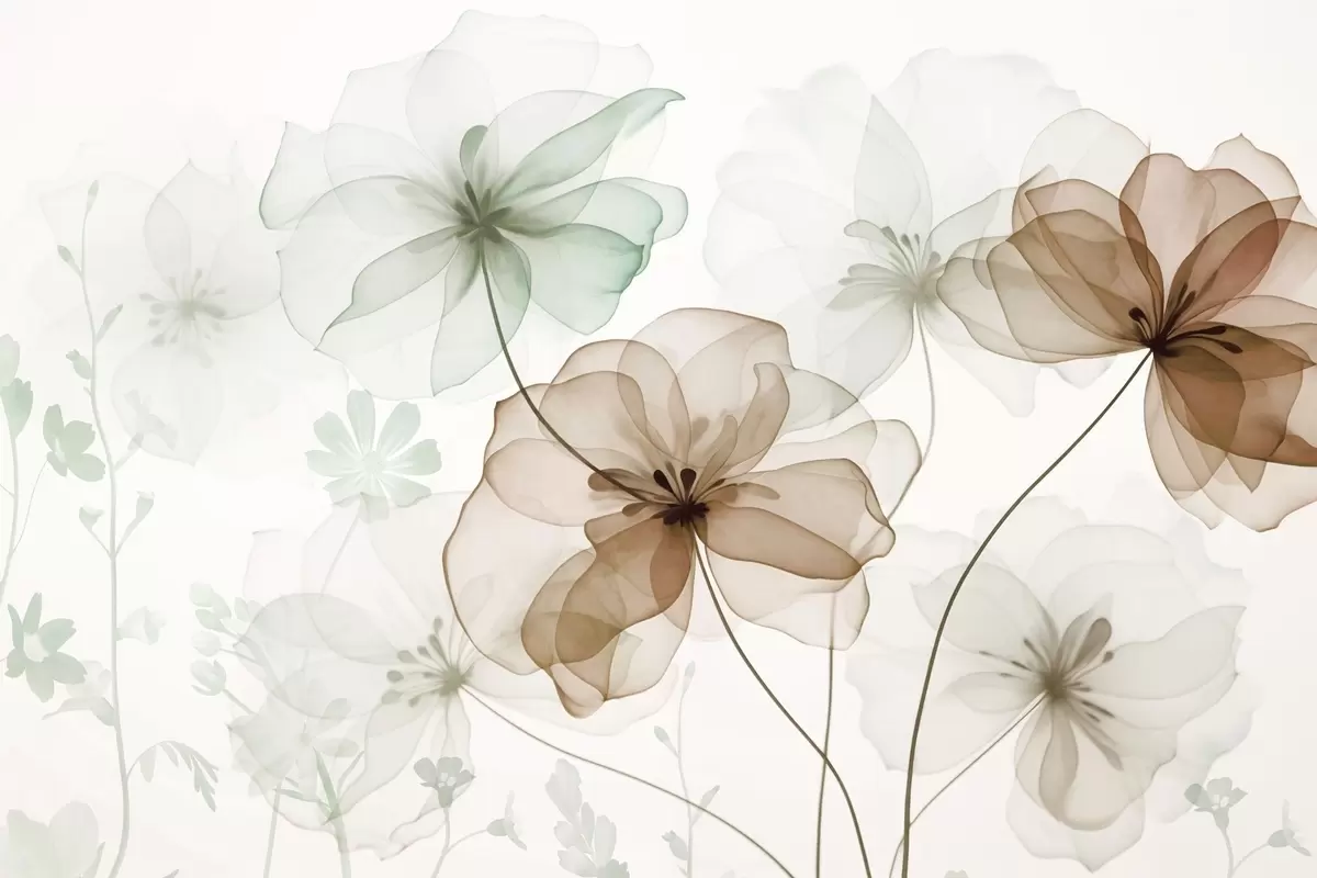 Fotomurales Flores translúcidas con pétalos marrones y verdes, tallos largos, fondo claro, colores suaves, diseño floral con textura. Nr. w09529